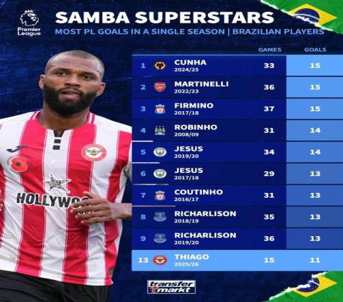 北京时间12月13日,德转列出了巴西球员英超单赛季进球数TOP10,马特乌斯-库尼亚、马丁内利以及菲尔米诺15球并列第一,本赛季英超前15轮就打进11球的伊戈尔-蒂亚戈位列第13位。