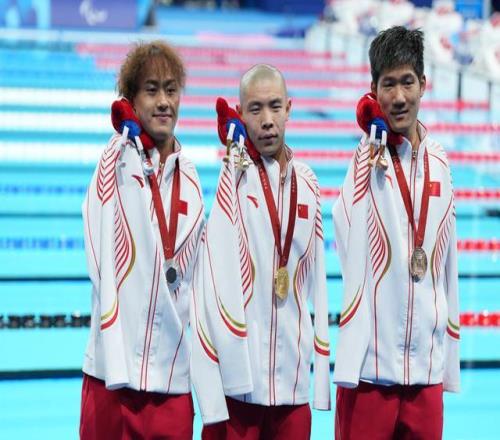 2024年9月6日,在巴黎残奥会游泳男子50米蝶泳S5级决赛中,中国选手郭金城(中)、袁伟译(左)、王李超包揽该项目冠亚季军。新华社记者 熊琦 摄
