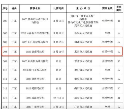《目录》显示,2026年全国预计举办492场马拉松赛事,设有全程马拉松和半程马拉松两个项目,A类赛事254场、B类赛事67场、C类赛事171场。广东将举办29场马拉松赛事,有17场A类赛事。惠州马拉松为A类赛事,暂定11月29日举行。