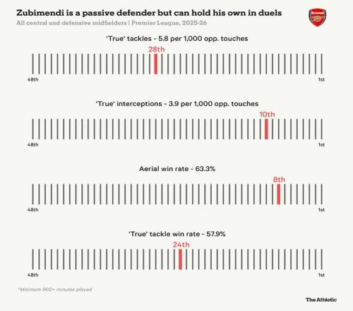 在他的处子赛季刚过半程之际,在所有为阿森纳在各赛事中出场至少900分钟的球员中,苏比门迪的场均抢断次数(每90分钟1.5次)排名第六,拦截次数(每90分钟1.2次)排名第二。
