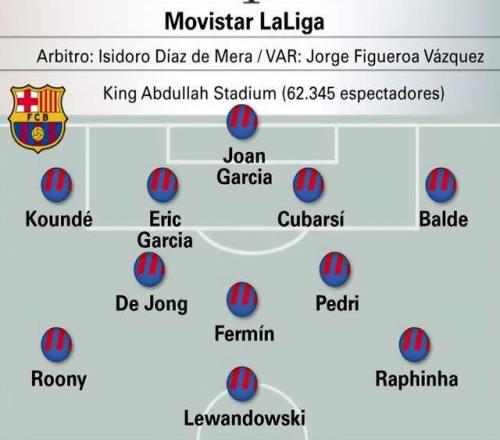 巴萨预计首发(433):霍安-加西亚/孔德、埃里克-加西亚、库巴西、巴尔德/德容、费尔明、佩德里/巴德吉、莱万、拉菲尼亚