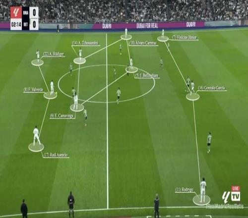 他们的阵型往往呈现出下图所示的样子(对阵贝蒂斯的比赛),目的是通过站位拉扯制造对手防线的空隙,再利用后插上跑动进行打击。为了让这一计划奏效,维尼修斯必须始终待在边路,吸引一到两名防守球员。