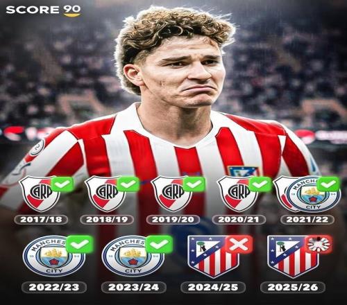 2024年夏天,阿尔瓦雷斯离开曼城加盟马竞。之后的一个半赛季,阿尔瓦雷斯已错失5项赛事的冠军,仍未收获马竞生涯首冠。