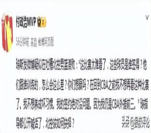 琼斯发微博疑似在吐槽北控男篮溃败:“这比赛太难看了,这些球员是谁签得?他们跟谁训练的,怎么会这么差?你们想赢吗?在回到CBA之前我不想再看这种比赛了。我不想养成坏习惯。我的签约绝对没问题。因为我仍是CBA外援前三。” 琼指导都公开喊话了,北控该如何抉择?
