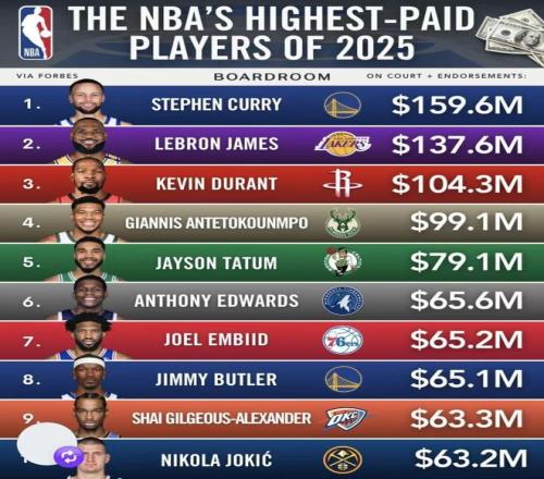 2025年NBA球员收入榜前10榜单发布:库里11.20亿元詹姆斯9.66亿