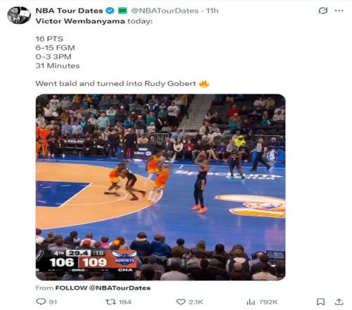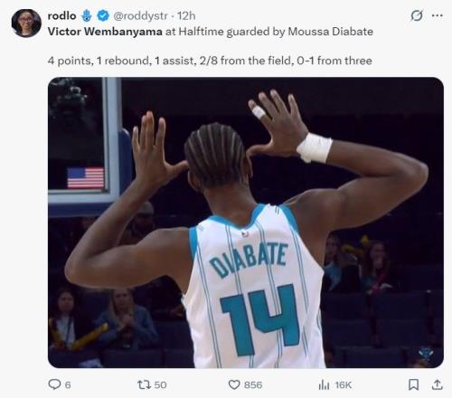 而跟文班亚马对位的2022年次轮43顺位的中锋迪亚巴特,全场比赛33分钟,9中6,拿到12分10篮板6助攻2盖帽,命中率66.7%,正负值+17,文班亚马2.24米,迪亚巴特只有2.08米,两人的强硬程度完全不同。