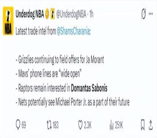 北京时间2月3日,ESPN名记Shams在播客节目中透露了诸多交易流言的细节,比如灰熊队的莫兰特已经收到一些报价、独行侠对队内大部分球员都听取报价、猛龙依旧对多曼塔斯-萨博尼斯有意、篮网开始将小波特视为未来的一部分。