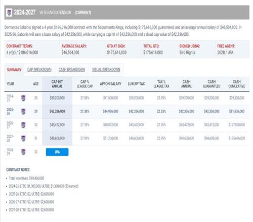 小萨今年29岁,他跟国王的合同是四年1.86亿含有激励条款,本赛季薪水4233万,小萨还余下三年合计1.47亿,这份合同真的不算小,而且本赛季小萨因为伤病的关系数据大幅下滑,场均29.6分钟,拿到14.3分11.2篮板4.2助攻1抢断0.18盖帽,命中率53.6%,三分命中率16%。