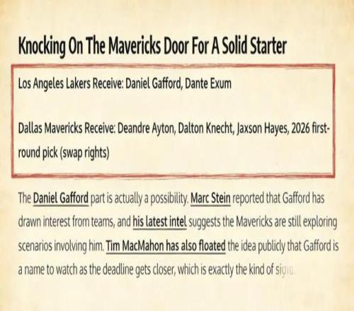 相比之下,湖人更希望引入一位能在防守端稳定贡献的内线球员。据NBA记者Jake Fischer报道,独行侠中锋加福德正是湖人寻求的替代选项,他甚至为湖人设计了一套交易方案——
